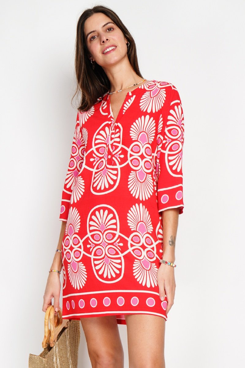 Robe midi en lin - Blanc, rouge et rose