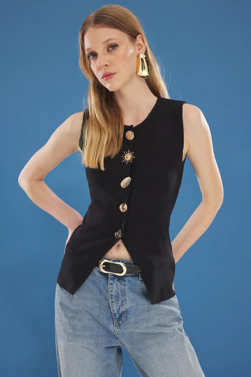 Boutons décoratifs et fente devant.