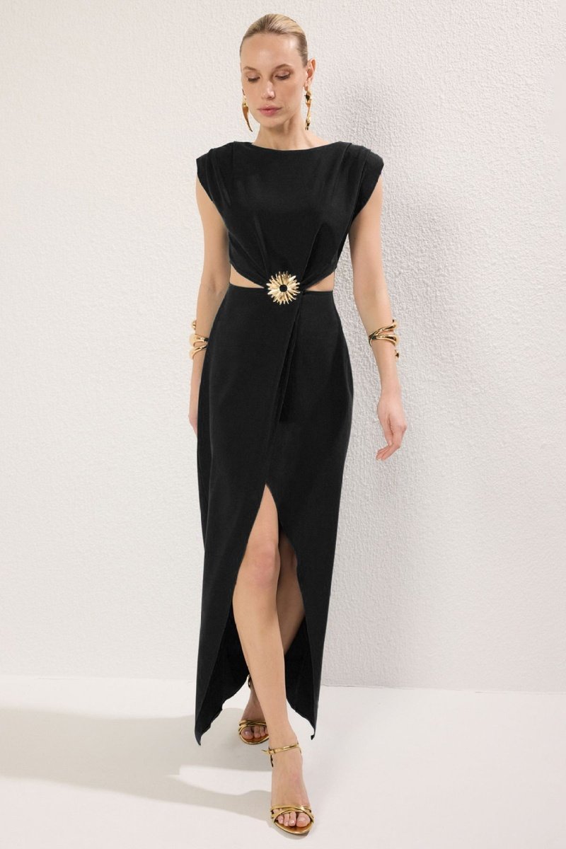 Empiècement en métal et fente devant.