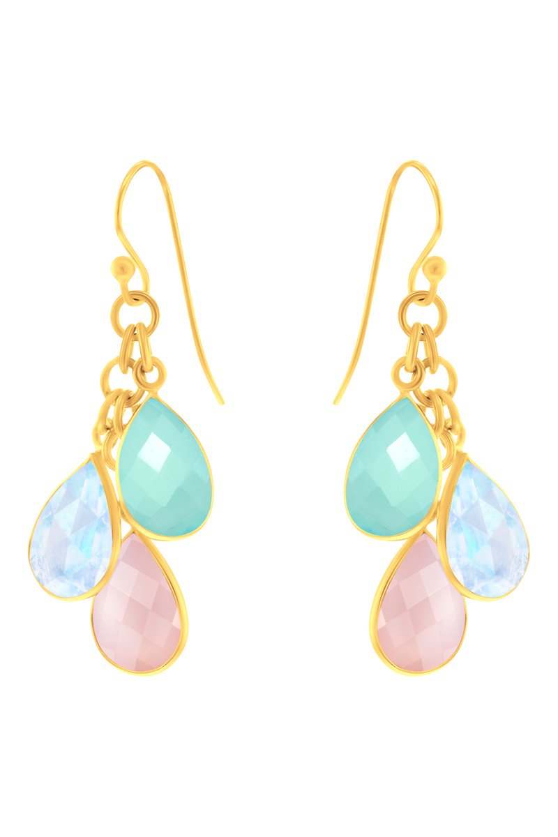 Boucles d'oreilles en argent plaqué or jaune serties de deux calcédoines et d'un rainbow moonstone. Fermoir crochet.