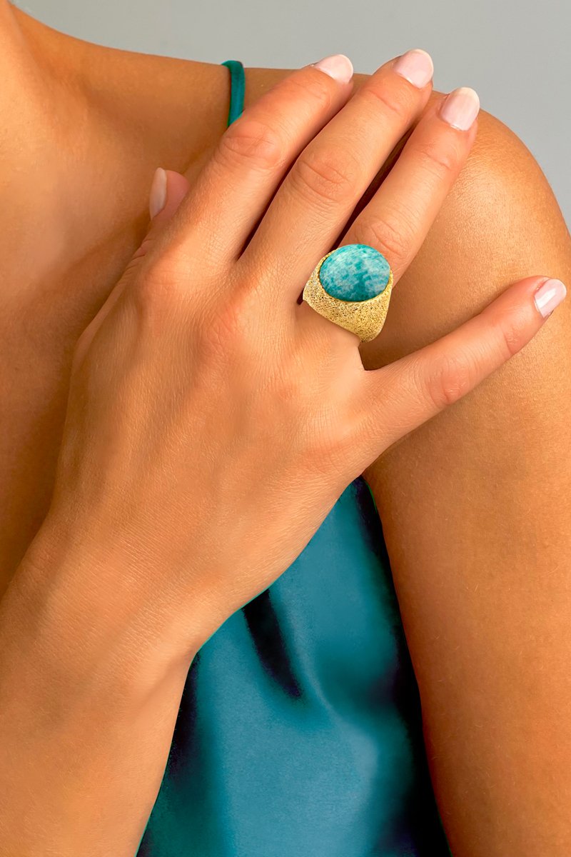 Bague en argent plaqué or jaune sertie d'une amazonite.