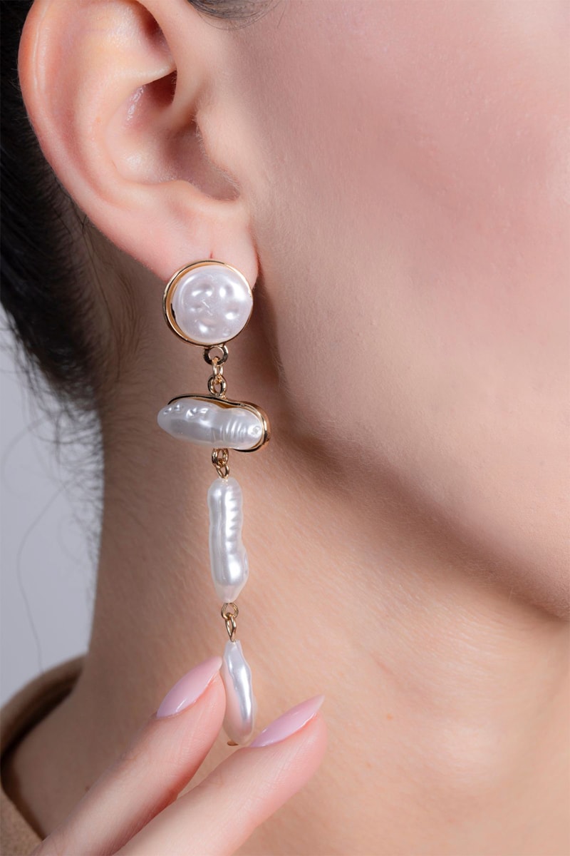 Boucles d’oreilles pendantes serties de 4 perles d’imitation.