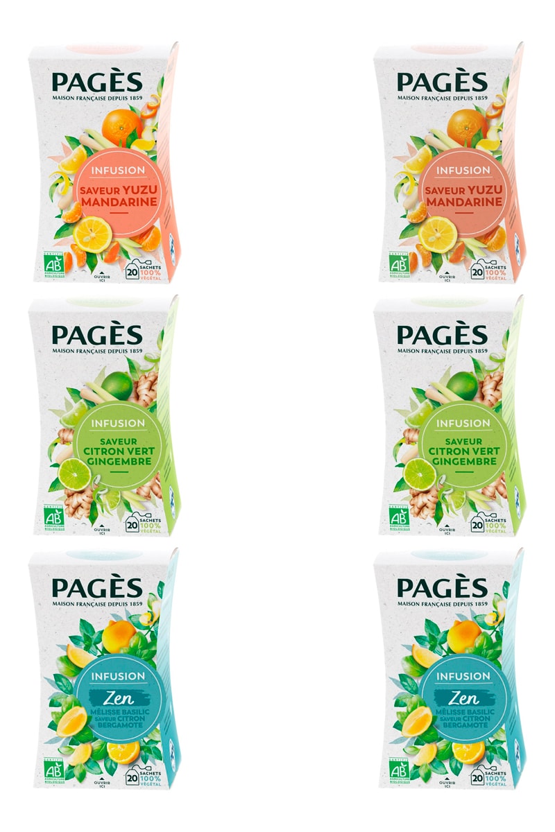 2 x Infusion BIO Yuzu Mandarine - 20 sachets, 2 x Infusion BIO Citron Vert Gingembre - 20 sachets et Infusion BIO Zen (Mélisse, basilic, citron bergamote) - 20 sachets