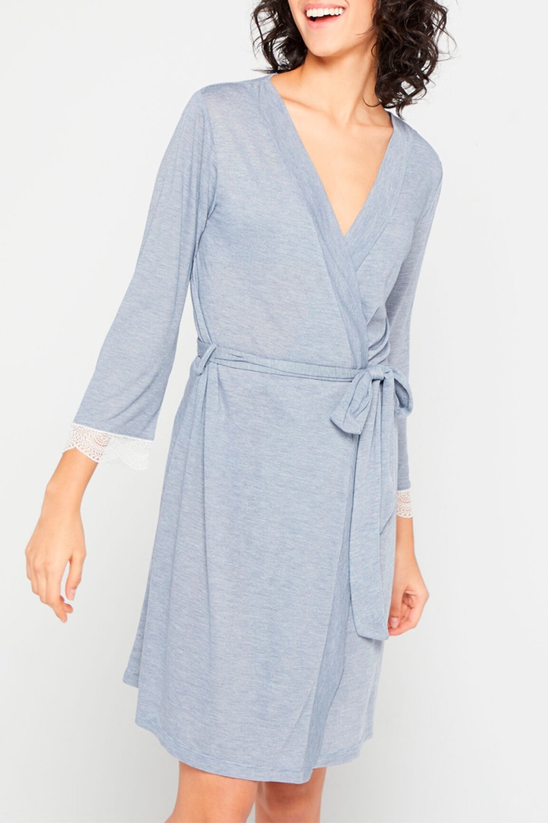 Déshabillé à manches mi- longues avec empiècement en dentelle.