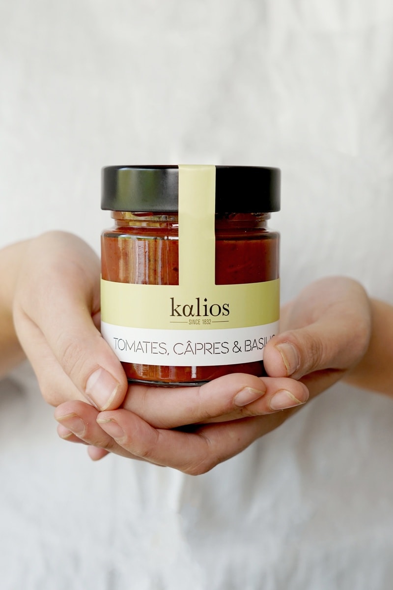 Ingrédients : tomates (88,5%), olives kalamata (4%), huile d’olive vierge extra (4%), câpres (1,5%) ail (1%), sel, poivre (< 1%), basilic (< 1%)