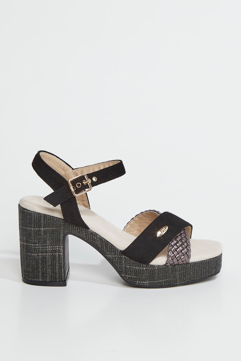 Brides croisées devant : 1 avec empiècement en métal et logo et 1 effet tressé.
