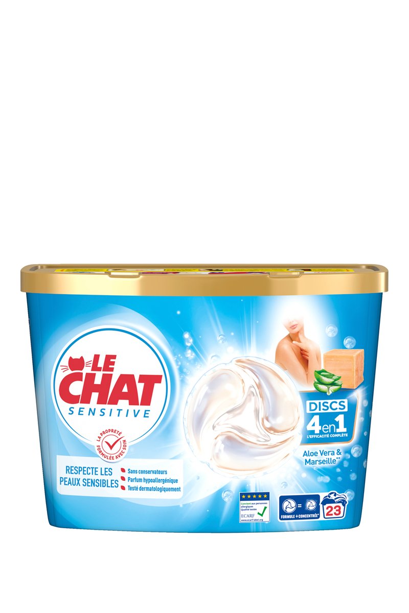 Le Chat Discs Sensitive Savon de Marseille & Aloe Vera, la capsule 4-en-1 qui vous garantit un linge propre tout en respectant les peaux sensibles, grâce à sa formule développée avec des dermatologues.