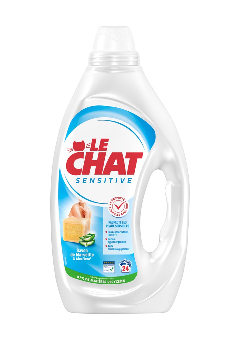 Le Chat Sensitive au Savon de Marseille et Aloe Vera* vous garantit un linge propre tout en respectant les peaux sensibles, grâce à sa formule élaborée avec des dermatologues.
