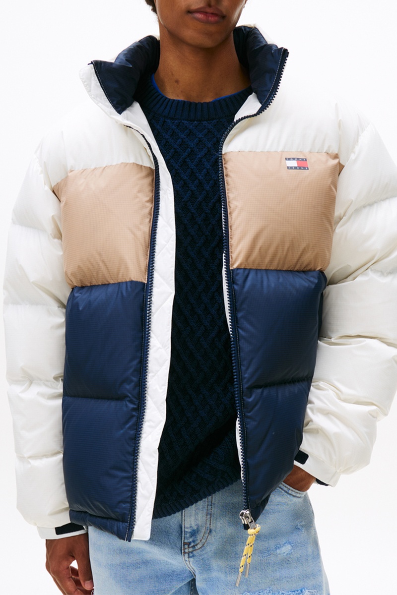 Doudoune à capuche amovible avec liens de serrage et barillets.
