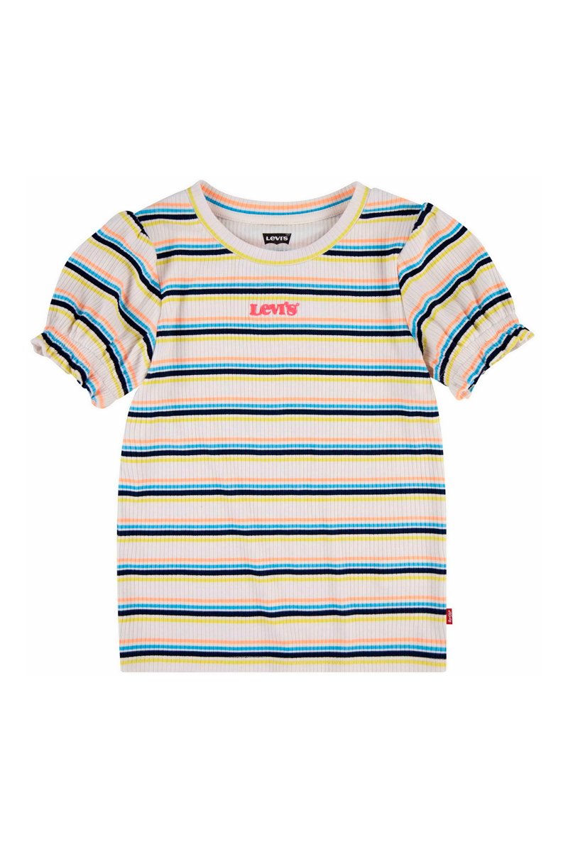 T-shirt côtelé doux et extensible avec rayures sur tout le corps dans un style classique des années 90 Manches froncées avec ourlet smocké Logo vintage moderne.