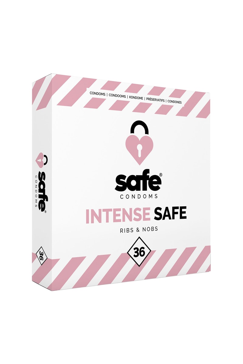 Le préservatif Safe Intense offre une protection parfaite et présente également des nervures et des picots pour une stimulation vaginale et clitoridienne optimale.