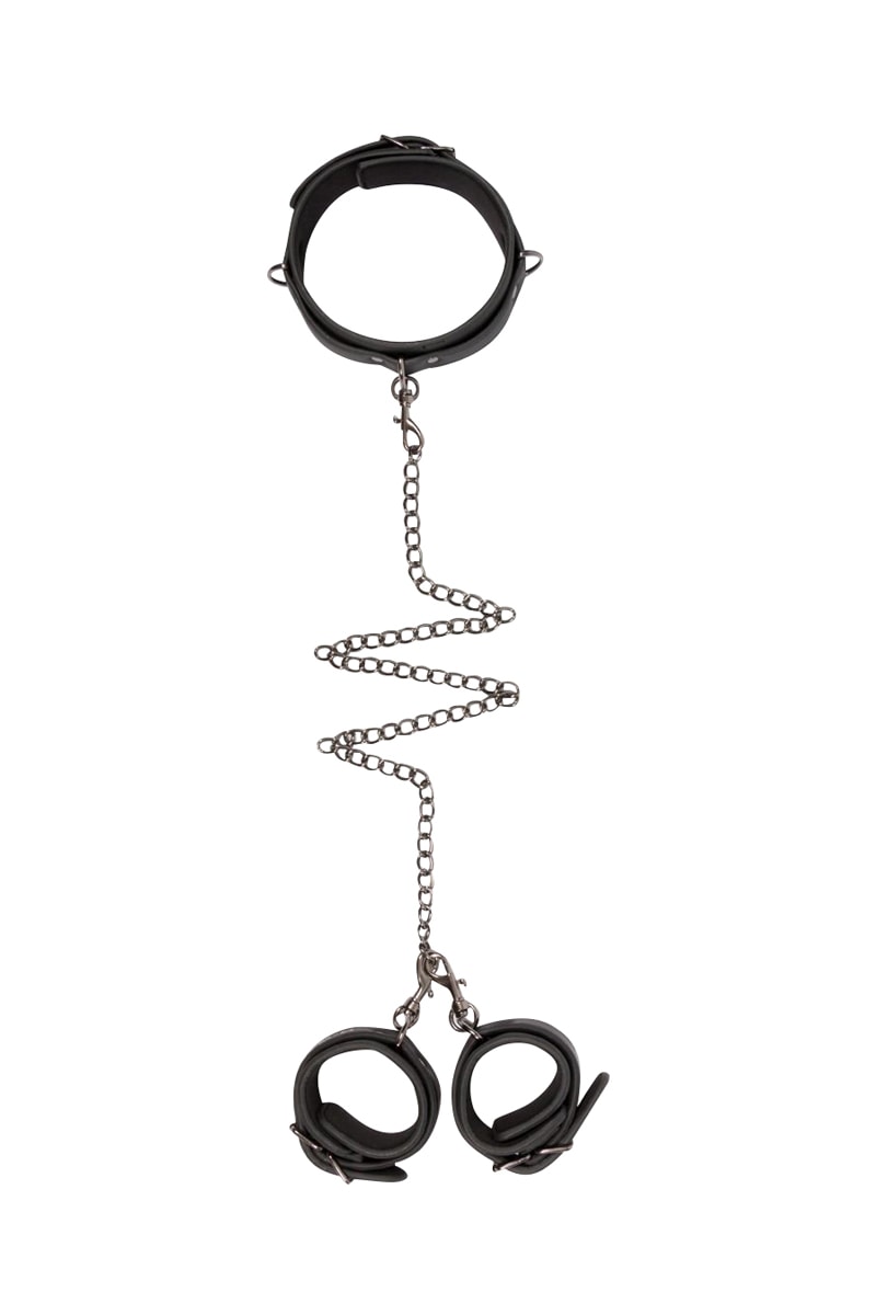Composé d'un collier avec des menottes de poignets qui peuvent être facilement détachées l'une de l'autre à l'aide de fixations à clips.
