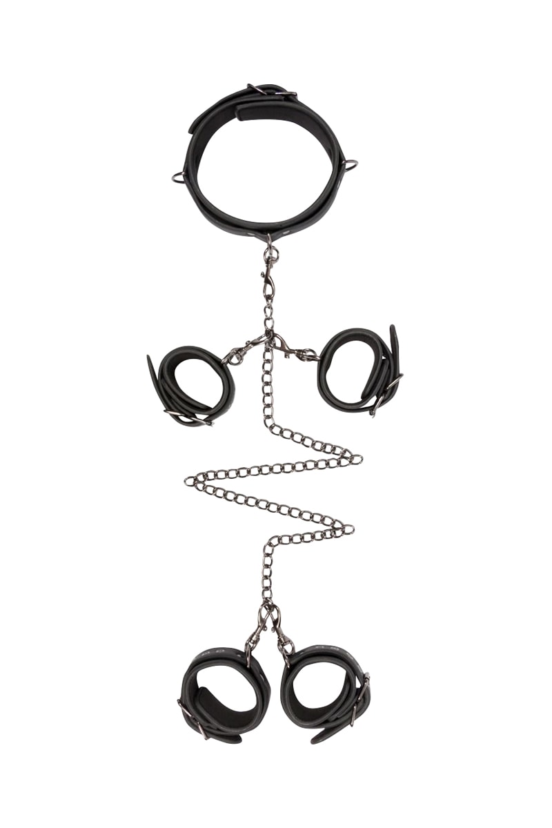 Mode d'emploi pour jouir pleinement : ajustez facilement le collier et les menottes de poignets et de chevilles.