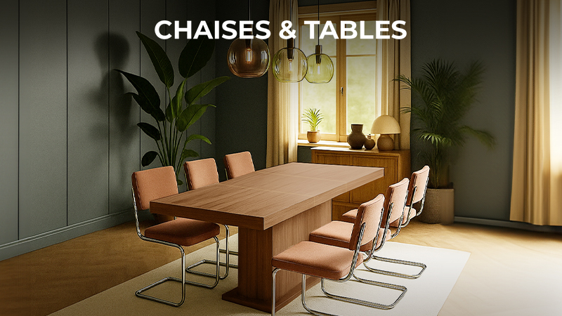La salle à manger, lieu de convivialité, doit allier fonctionnalité et esthétique. Optez pour des tables robustes en bois massif ou avec des touches modernes en métal et verre, faciles à entretenir. Les chaises coordonnées se déclinent en divers matériaux comme le bois, le métal, et la résine tressée pour diversifier confort et durabilité. Les ventes privées peuvent aussi offrir des ensembles de vaisselle et articles de table pour ajouter une touche unique à vos repas.