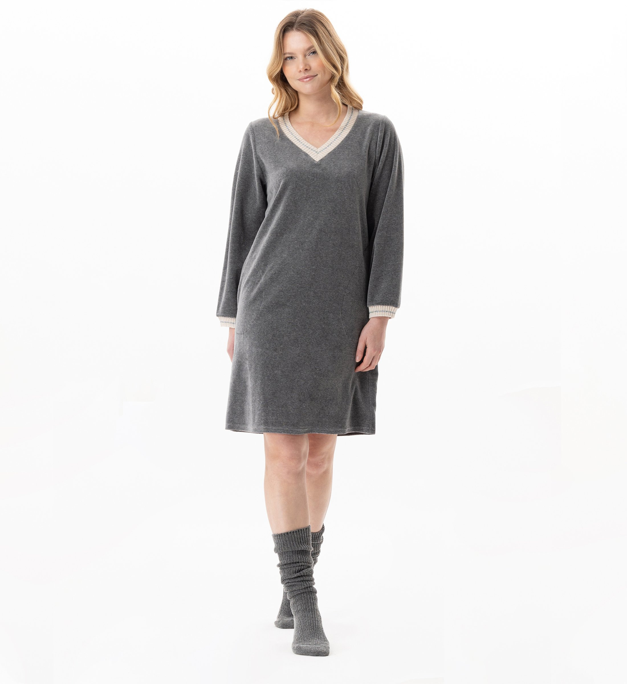 Le haut de la robe, inspiré d’un sweatshirt, se distingue par son col V et ses poignets finis par un bord-côte, pour une tenue homewear aussi élégante que confortable.