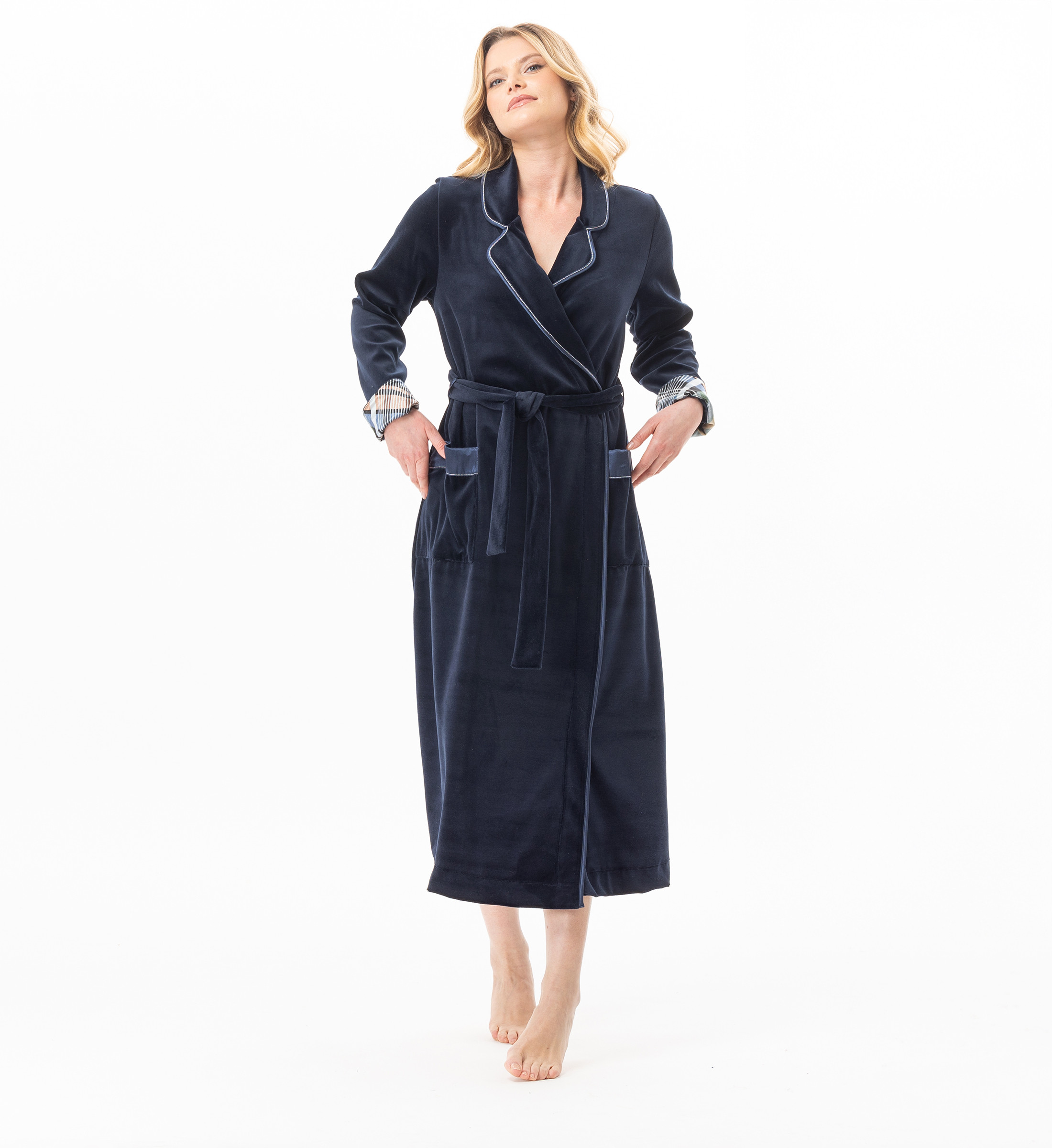 Tout ce qu’on attend d’un peignoir ! Chaud, confortable, bien coupé, élégant tout en restant facile à porter. Ses finitions satinées et ses touches d’imprimé tartan exclusif Bradley en viscose apportent la juste dose de chic au velours bleu nuit.