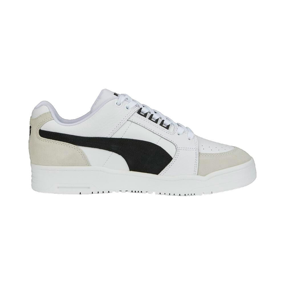 Basket Puma Slipstream Lo Suede FS blanche et noire. Modèle classique des années 80, avec tige en cuir et suède, lacets plats, bande PUMA Formstrip et semelle en caoutchouc. Parfaite pour un style lifestyle.