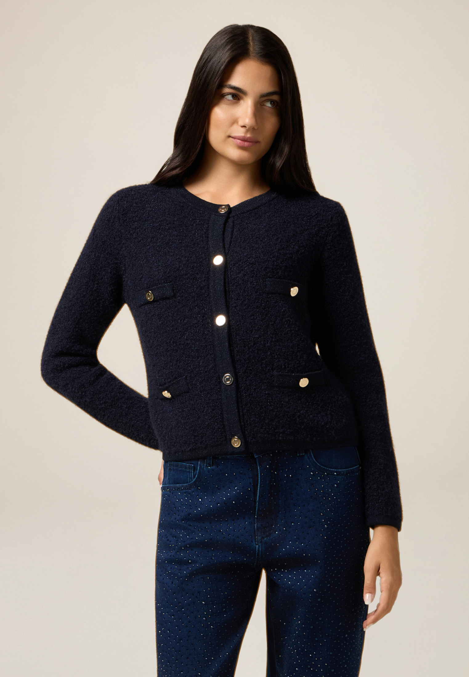 Cardigan réalisé en maille épaisse ; modèle court à effet veste ; encolure ronde, boutons décoratifs en métal, manches longues.