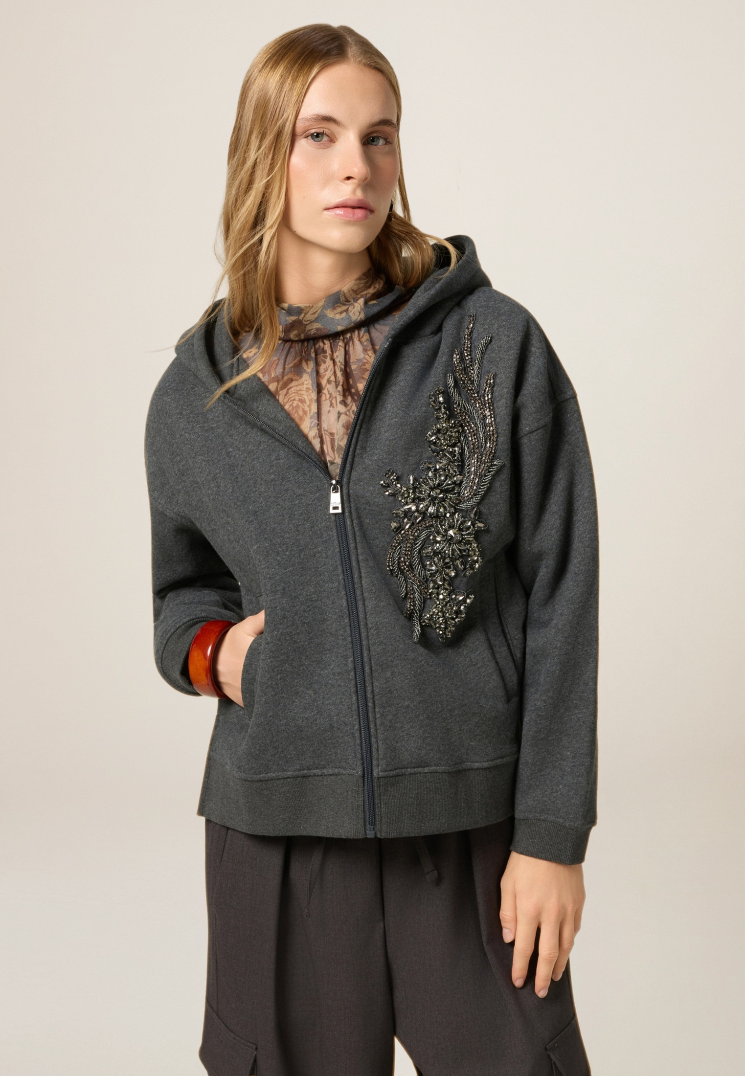 Sweat-shirt ouvert en tissu mélangé ; coupe régulière avec fermeture éclair frontale ; capuche intégrée, manches longues et applications décoratives sur le côté.