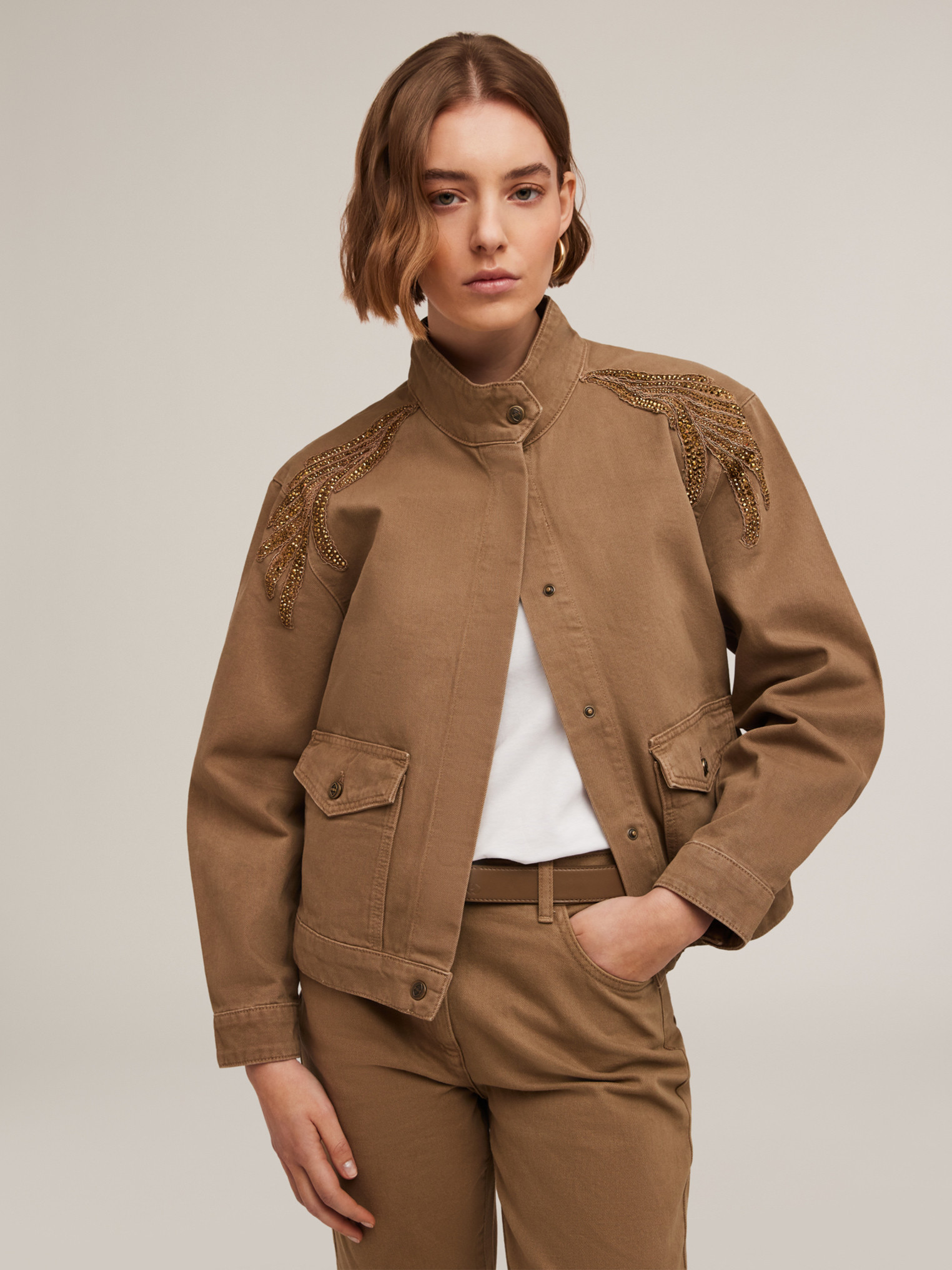 Blouson en drill de coton teint en fil ; col montant et boutonnage caché avec boutons-pression, poches plaquées à rabat devant ; manches longues avec patch brodé sur l’épaule ; Article lavé avec des procédés qui, grâce à l'utilisation de technologies de production avancées, favorisent des économies d'eau jusqu'à 60 % par rapport à un lavage conventionnel. Les données sont indiquées par le fournisseur sur la base de tests d'auto-évaluation de la consommation d'eau pendant le traitement, comparée à celle de lavages traditionnels équivalents.