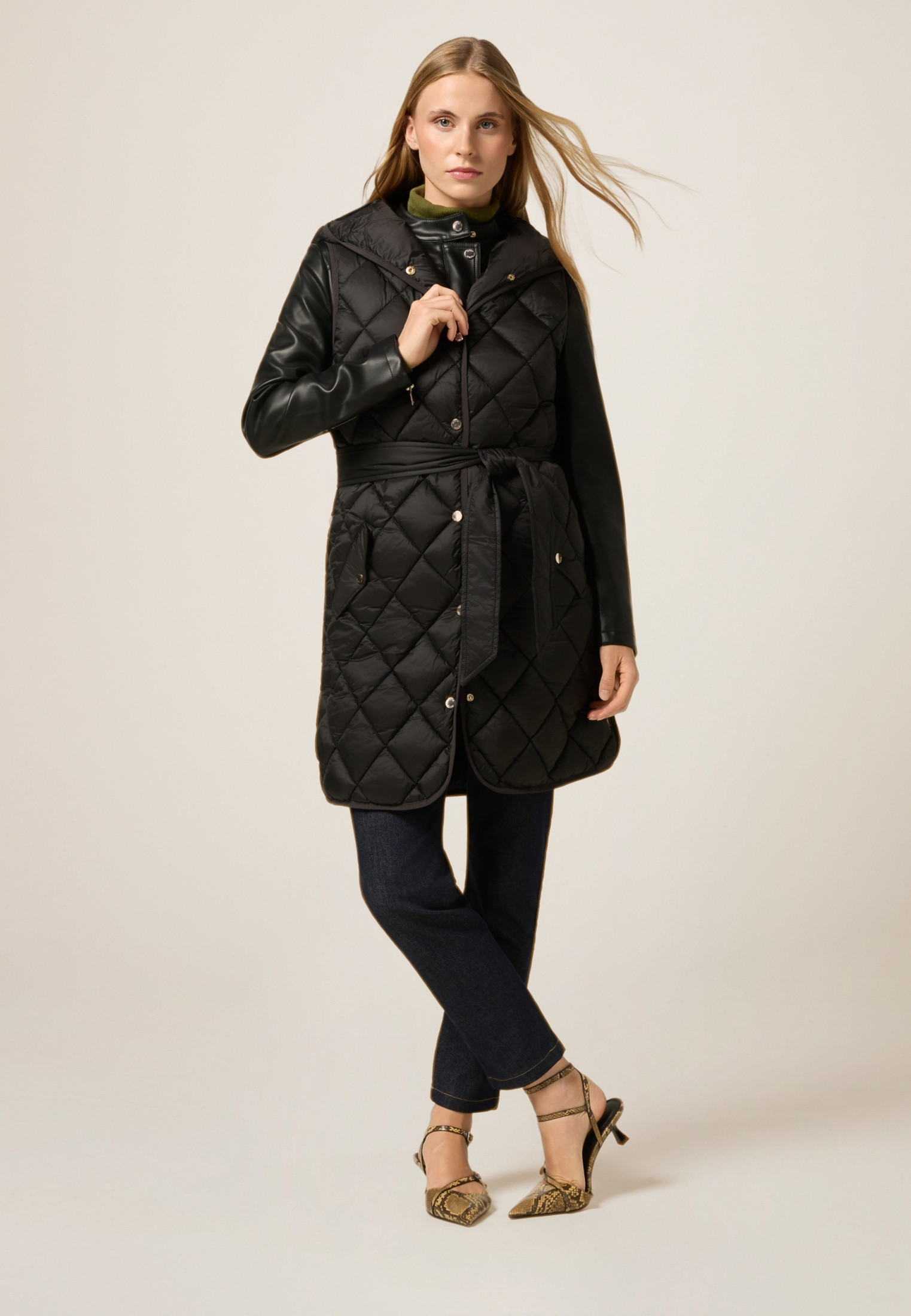Gilet matelassé léger sans manches ; longueur moyenne, fermeture à boutons ; ceinture à nouer à la taille, capuche, poches frontales avec boutons-pression.