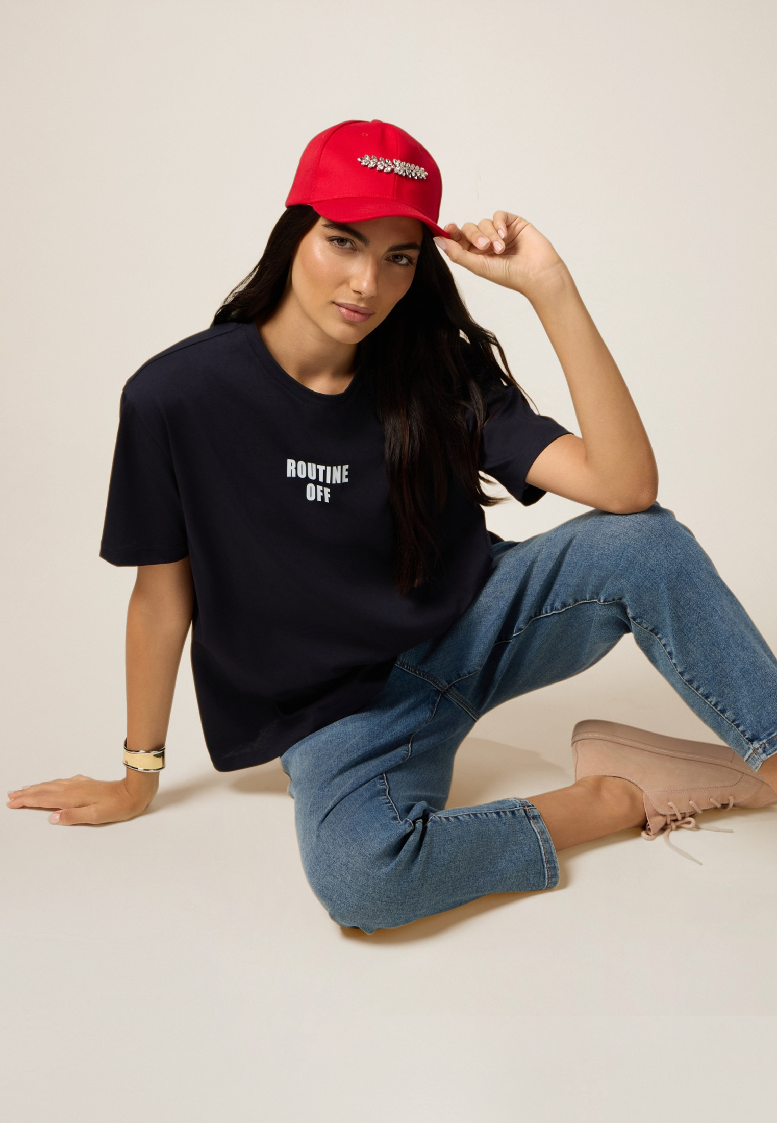 T-shirt avec impression graphique sur le devant ; ligne boxy, manches courtes et encolure ronde. Casquette en 100% coton. ; FABRIQUÉ EN ITALIE.