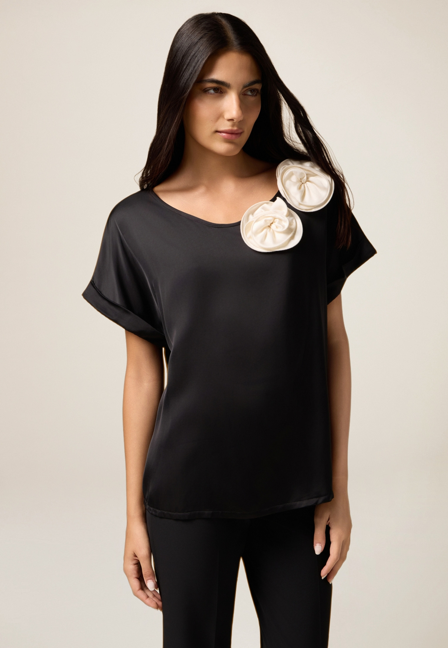 T-shirt avec devant et décorations florales, en contraste de couleur ; manches courtes avec revers au bas et encolure bateau ; FABRIQUÉ EN ITALIE.