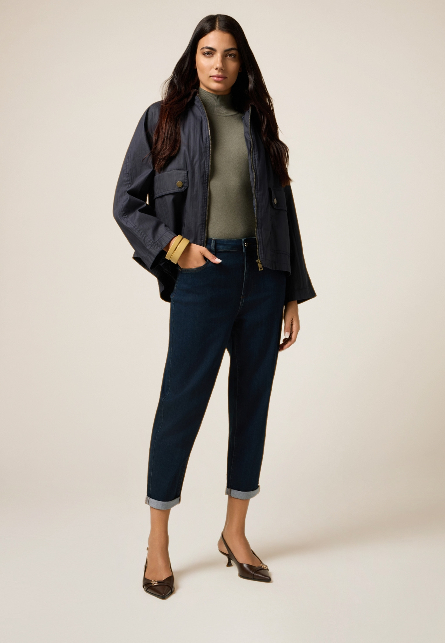 Jean boyslim réalisé en denim avec un lavage bleu foncé ; modèle cinq poches avec fermeture à bouton et zip ; détail métallique sur la poche avant droite.