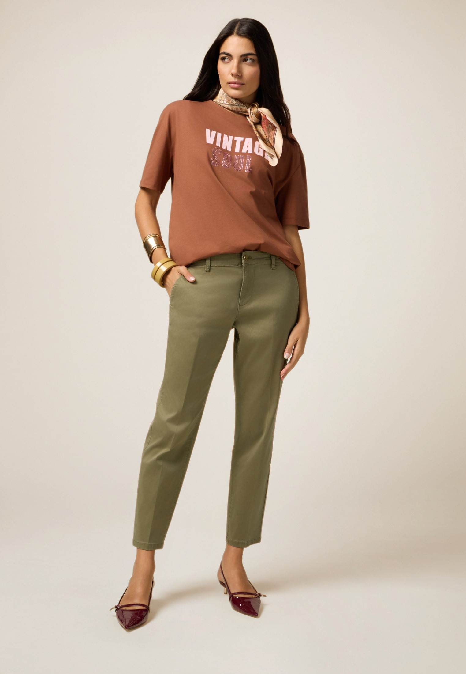 Pantalon chino réalisé en tissu ; longueur cheville ; fermeture à bouton et à glissière avec détail décoratif de chaîne en métal.