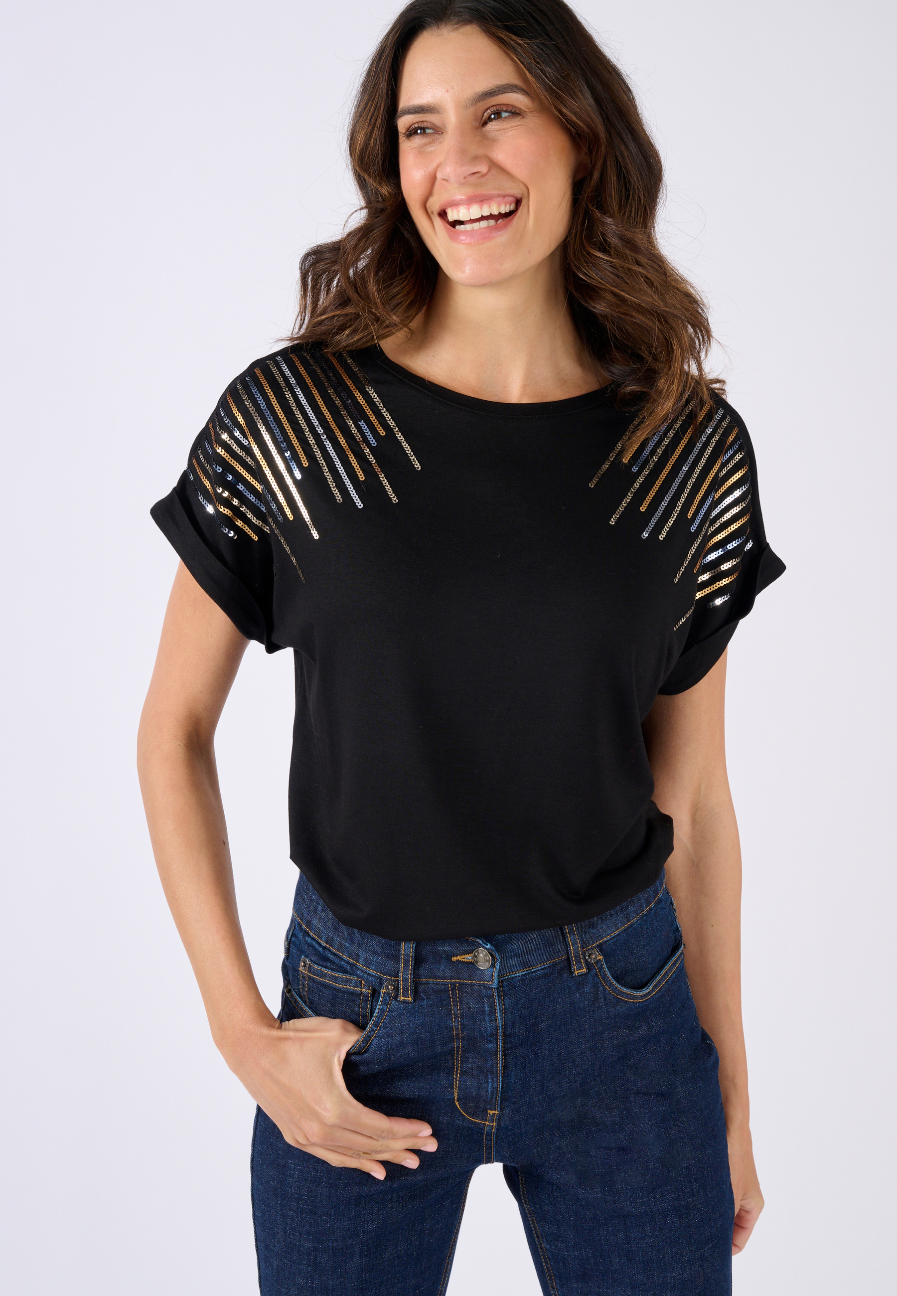 Information sur l'offre : Ce t-shirt noir en maille jersey fluide viscose stretch est la pièce parfaite pour briller lors des fêtes. Son col rond classique et ses manches courtes à revers apportent une touche de simplicité, tandis que les sequins subtils ajoutent une dose d'éclat qui capte la lumière sans en faire trop. Avec sa coupe confortable et élégante, il combine à la perfection un effet sobre et raffiné, tout en garantissant un look moderne et tendance. Ce t-shirt est l'allié idéal pour celles qui souhaitent se démarquer avec élégance pendant les fêtes. Longueur du t-shirt femme 61 cm environ.