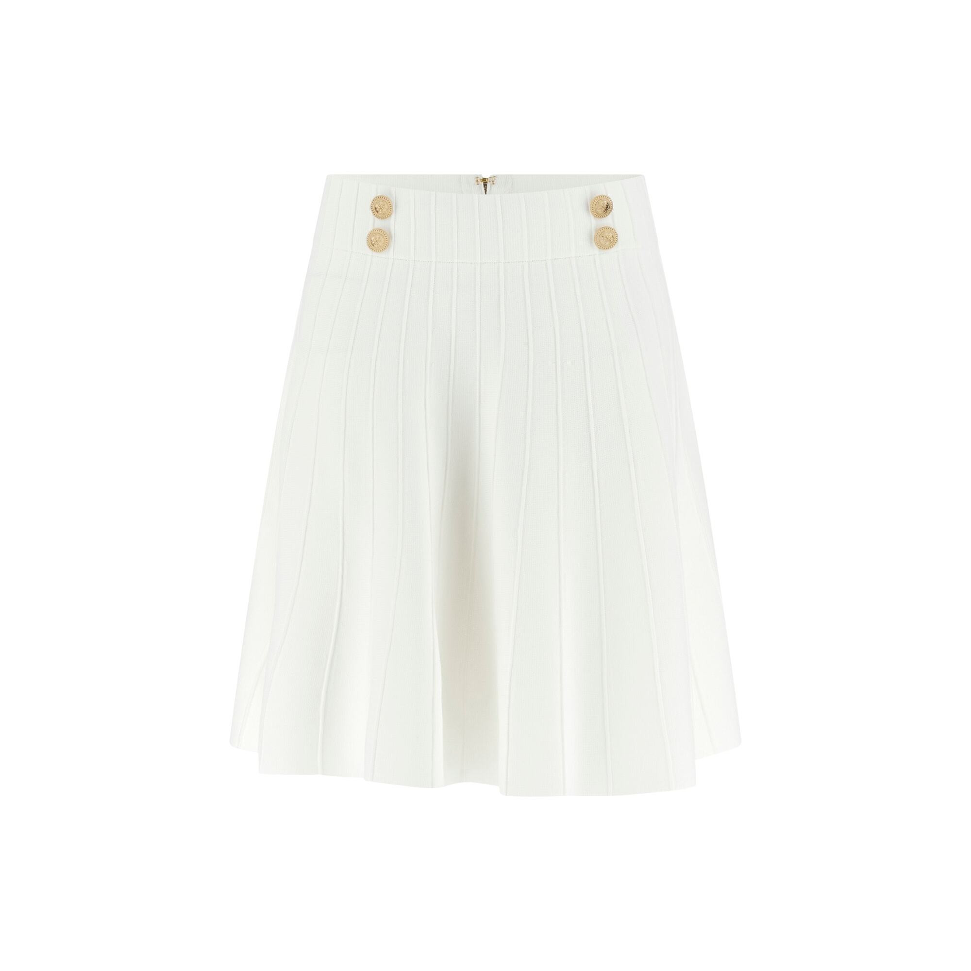- Mini-jupe en maille de viscose mélangée. - Taille moyenne classique. - Plis all-over. - Boutons décoratifs sur le devant de la taille. - Fermeture à glissière.