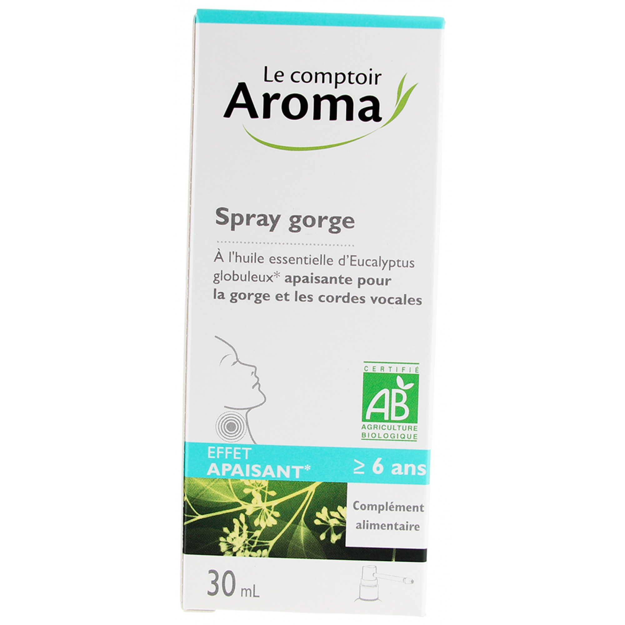 Le Comptoir Aroma Spray Gorge Effet Apaisant Biologique 30 ML est un complément alimentaire formulé à base de miel, de propolis, d’extraits de plantes (échinacée pourpre, sauge, plantain) et d’huile essentielle d’eucalyptus globuleux Conçu pour soulager les irritations de la gorge, du pharynx et des cordes vocales, il est particulièrement adapté en cas de gêne liée au froid, à la pollution ou à une sollicitation excessive de la voixSa formule biologique associe des ingrédients aux propriétés adoucissantes, apaisantes et protectrices, qui contribuent à calmer les sensations de picotement tout en favorisant le bien-être respiratoireL’action combinée de la propolis et de l’eucalyptus globuleux procure un soulagement rapide et naturel, pour un confort retrouvé au quotidienCe spray constitue une solution douce et fiable pour apaiser les muqueuses sensibles et soutenir les voies respiratoires de manière ciblée Certifiés Agriculture Biologique. Contrôle FR-BIO-01