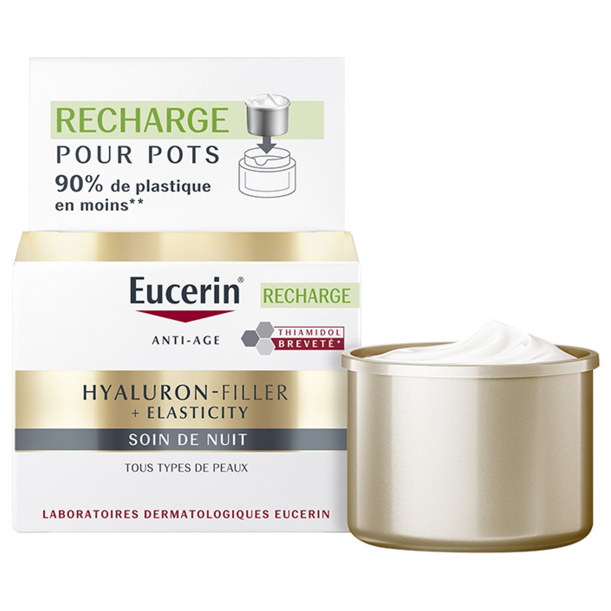 Eucerin Hyaluron-Filler + Elasticity Soin de Nuit Tous Types de Peaux Recharge 50 ml est un soin spécialement formulé pour atténuer les signes avancés du vieillissement pendant la nuit.Il permet : L'amélioration de l'élasticité : le Complexe Collagène-Élastine, une puissante combinaison d'Arctiine et de Créatine, stimule la production naturelle de collagène** et augmente l'élasticité de la peau.L’Arctiine s'affiche comme un véritable booster de collagène, qui freine les méfaits du vieillissement cutané, répare visiblement le derme et renforce l'élasticité de la peau, avec une réduction significative des rides.La réduction des taches brunes liées à l'âge : la formule au Thiamidol réduit l'apparence des taches brunes liées à l'âge.Le comblement des rides :  L'Acide hyaluronique de haut poids moléculaire contribue à améliorer l'hydratation de la couche superficielle de l'épiderme (d'où proviennent les rides et ridules), tandis que l'Acide hyaluronique de bas poids moléculaire pénètre plus profondément dans les couches épidermiques.Résultat : une peau à l'apparence plus jeune, plus lisse et éclatante.Enrichi en huile d'argan, riche en acides gras, il aide à régénérer et nourrir intensément la peau durant la nuit. Écologique, cette recharge permet d'économiser 90% de plastique (par rapport à un pot ordinaire). Très bonne efficacité et tolérance cutanée.