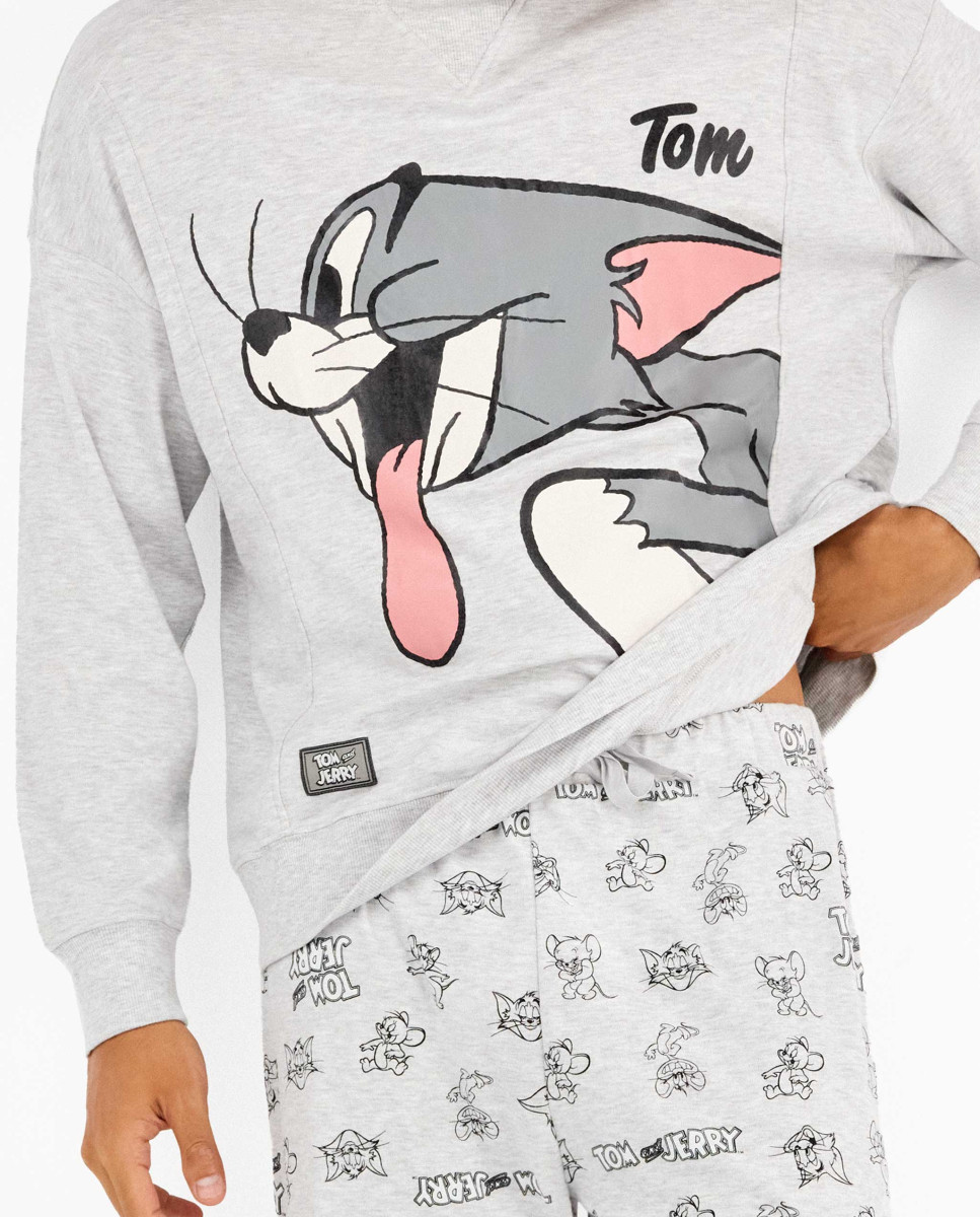 Ensemble pyjama en interlock composé d'un tee-shirt type sweat gris avec un imprimé de Tom, avec des bords-côtes aux manches avec détail d'étiquette et pantalon gris avec imprimé de Tom&Jerry élastique avec taille ajustable par cordon.