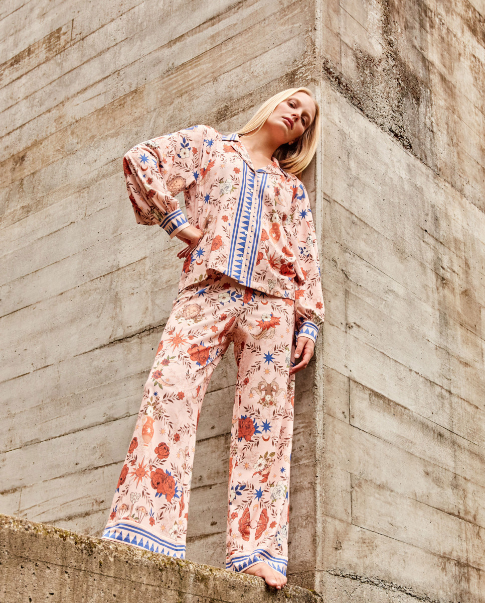Pyjama chemisier avec manche bouffante et pantalon palazzo imprimé dans des tons chauds rosés inspirés par des motifs zodiacaux, des fleurs, et les étoiles réalisé en Viscose toucher soie.