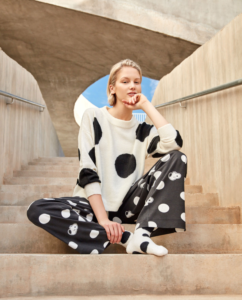 Pull tricot à gros pois large en noir et blanc.