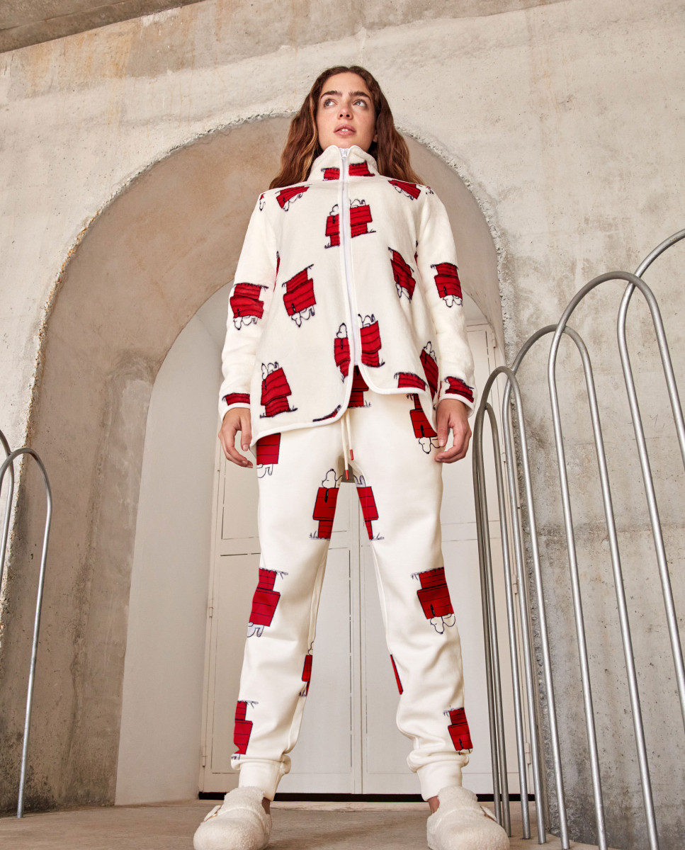 Peignoir en peluche ultra doux avec col haut, fermeture éclair à l'avant avec motif de la maisonnette de Snoopy, fini avec des liserés contrastés.