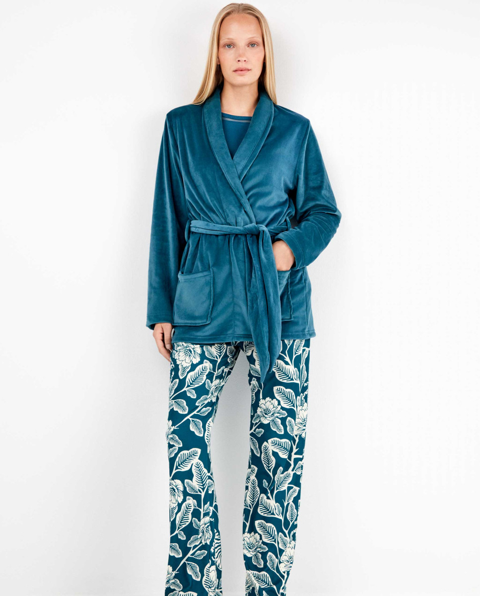 Peignoir en tissu polaire micro-élastique couleur noire noué à la taille et col à revers couleur aigue-marine.