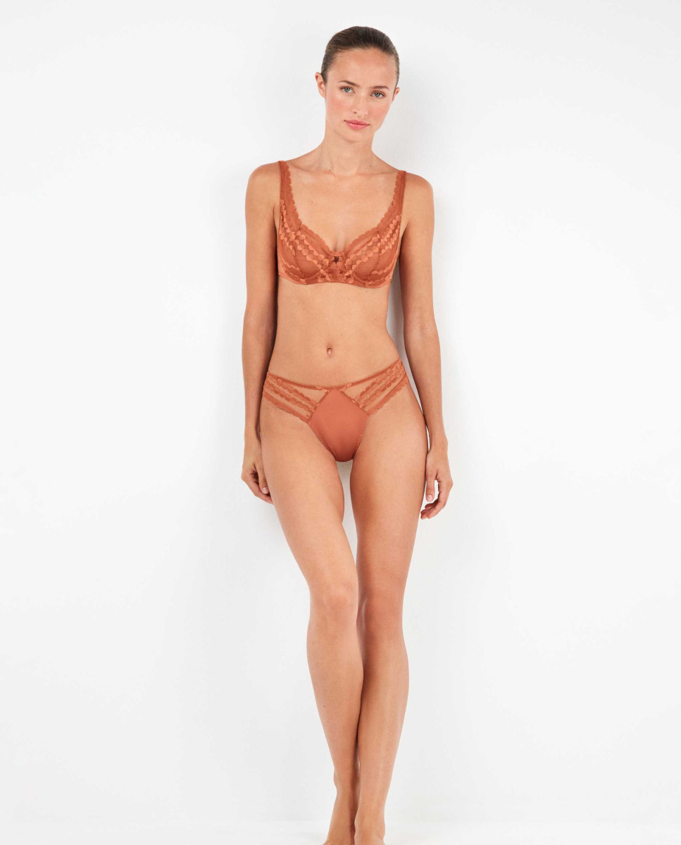 Culotte brésilienne en dentelle et microfibre disponible en couleurs noir et marron terracotta.