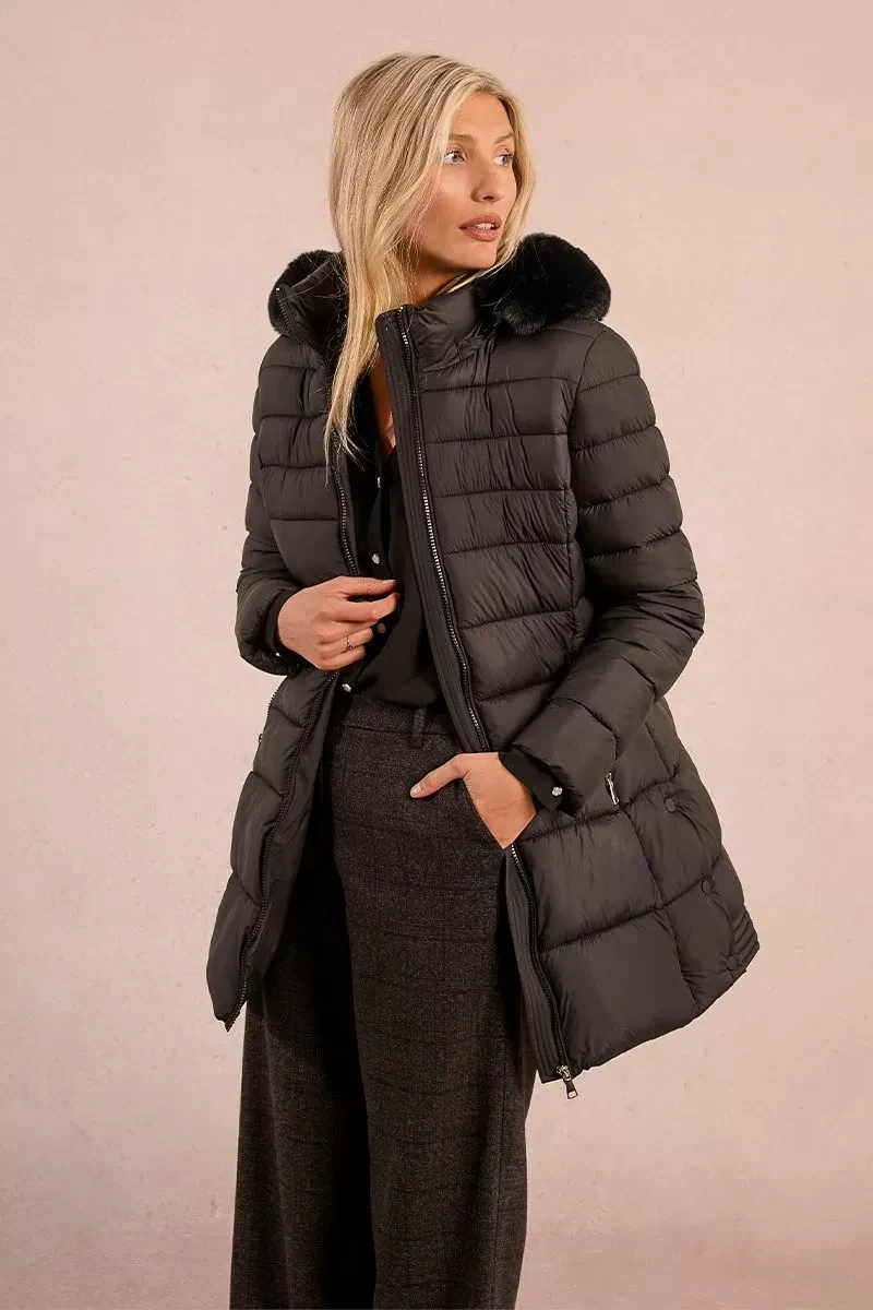 -Longue doudoune matelassée -Manches longues -Coupe ajustée -Capuche à fausse fourrure -Fermeture par zip sur toute la longueur devant -Poches à zip sur les côtés devant -Doublée -Longueur depuis l'épaule 81 cm pour une taille S