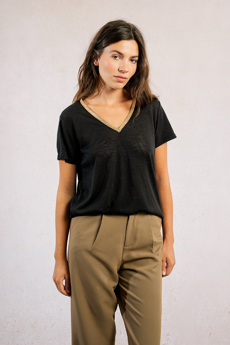 Molly Bracken - T-shirt encolure V irisée - T427DN - Noir - Femme