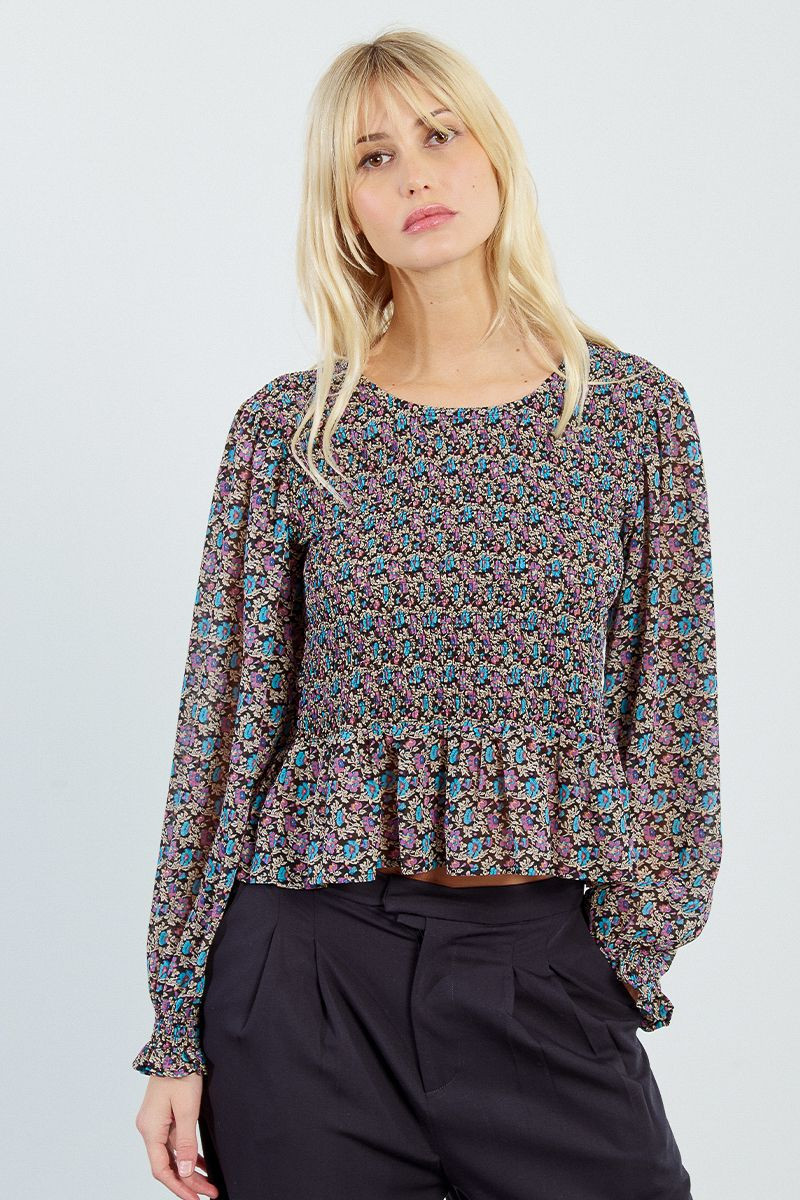 -Top à l'imprimé floral-Manches longues ballon-Poignets smockées, finition volantée-Encolure ronde-Buste smocké-Large volant sur le bas-Maintien par des liens à nouer dans le haut du dos-Longueur depuis l'épaule 53 cm pour une taille S