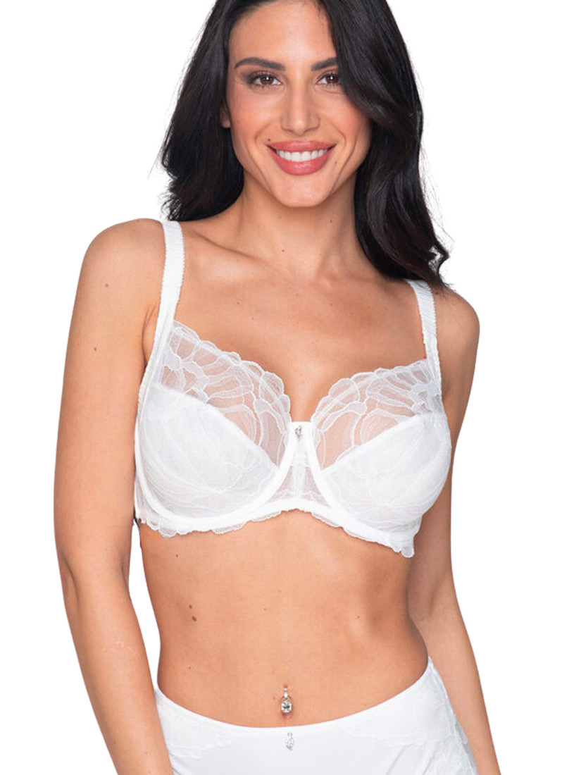 Soutien-gorge grande capacité très confortable, orné de dentelle jacquard délicate pour un style romantique très féminin. Avec effet de contrôle enveloppant, non préformé, il est doté d'armatures et sculpe naturellement la poitrine sans en augmenter le volume. Idéal pour les femmes ayant une poitrine généreuse et cherchant un maintien stable. Dos en forme de U pour plus de maintien. Le décolleté et les bordures à l'avant sont délicatement festonnées pour une touche romantique supplémentaire. Le tissu italien Sensitive® laisse respirer votre peau tout en vous donnant la sensation d'une seconde peau. Les fines bretelles sont réglables pour un ajustement parfait. Petit bijoux décoratif entre les bonnets.