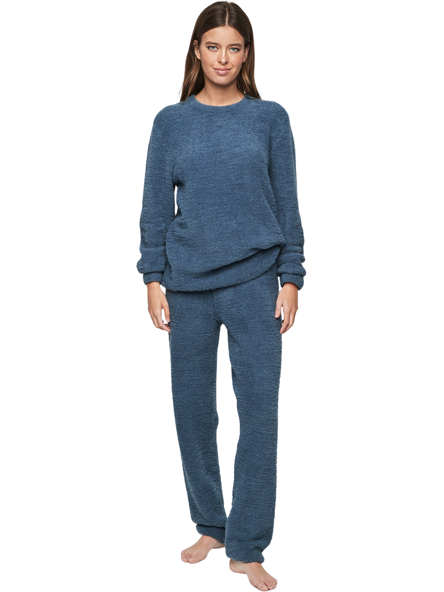 Ensemble de nuit pensé pour les soirées cocooning et les moments de détente à la maison : chaud, doux et ultra confortable, tout en restant chic. Le haut est un pull à manches longues, de coupe droite et ample avec un col rond. Le pantalon droit, avec une taille élastiquée, offre une grande liberté de mouvement et un confort optimal. Son tissu effet peluche invite à la détente et vous offrira une sensation de chaleur moelleuse pour vous garder au chaud tout en douceur.