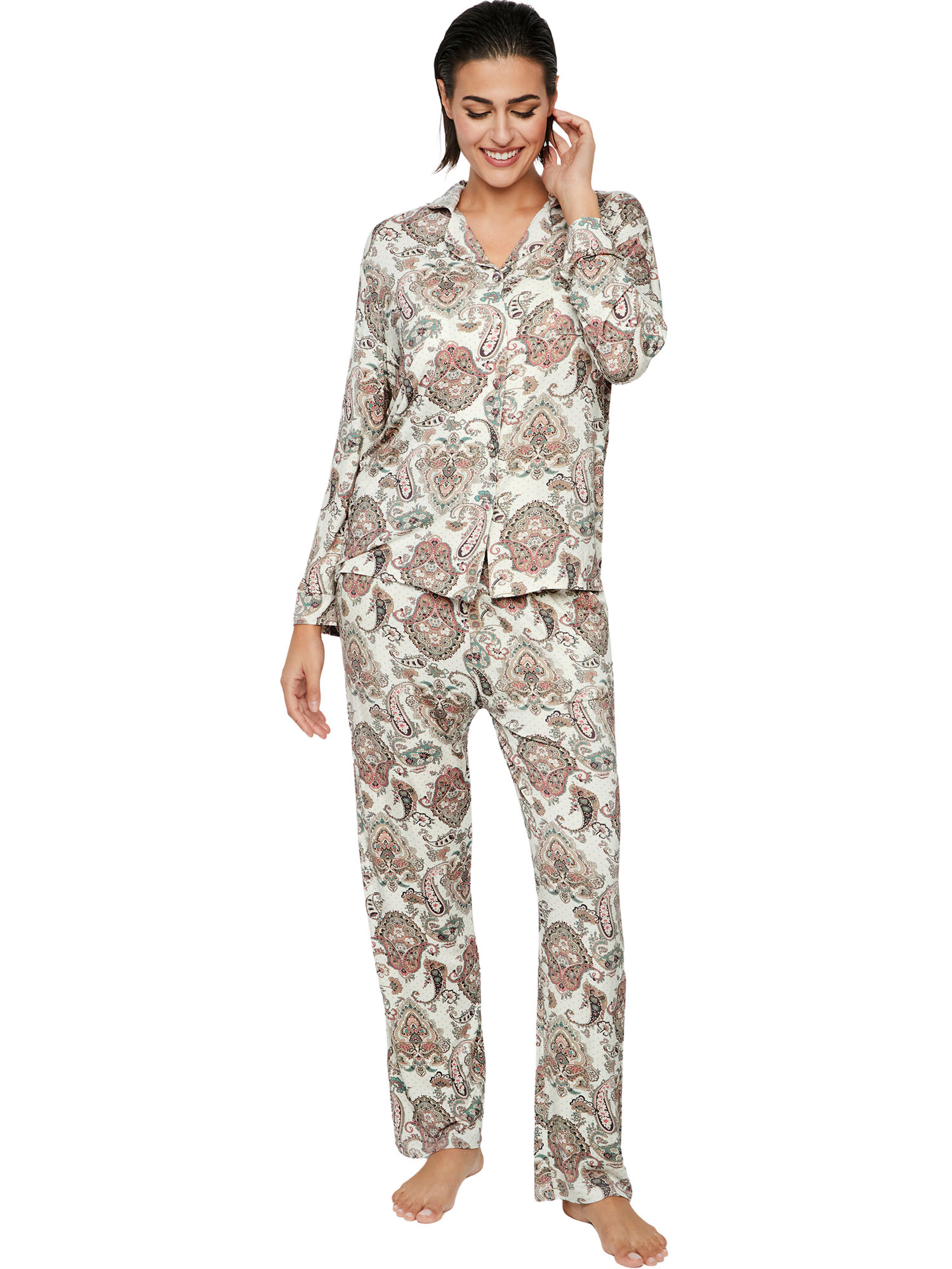 Offrez-vous des nuits douces et élégantes avec cet ensemble de nuit confectionné dans un tissu à base de bambou offrant un confort absolu. Il se compose d'un pantalon et d'une chemise à manches longues entièrement imprimés d’un motif cachemire dans des tons doux qui donnent un style élégant et raffiné. Il sera parfait à porter pour vos soirées de détente et vos nuits plus fraîches d'hiver. Le pantalon a une taille élastique pour un confort optimal, et la chemise se ferme sur l'avant grâce à une patte boutonnée. C’est une tenue de nuit qui allie élégance et confort, parfait pour se sentir chic même à la maison.