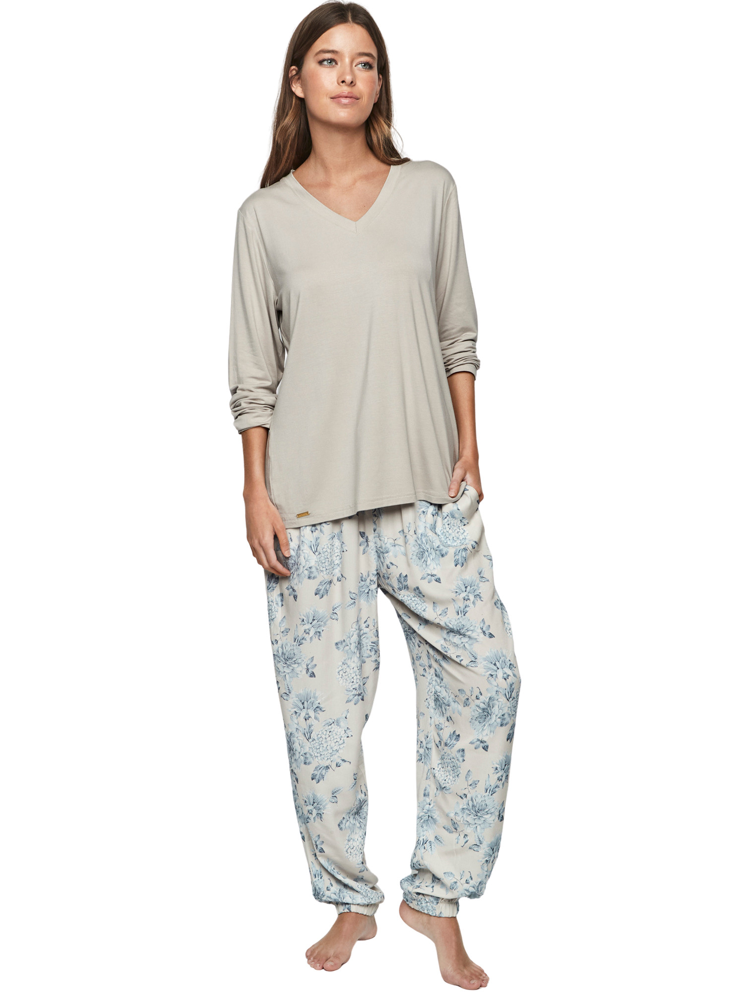 Ensemble de nuit, dans un style classique, qui  se compose d'un pantalon et d'un haut à manches longues. Entièrement en tissu viscose doux et léger sur la peau, il sera parfait à porter pour vos soirées de détente et vos nuits plus fraîches d'hiver. Le pantalon, entièrement  imprimé d'un motif floral délicat et élégant, a une taille élastiquée réglable grâce à un cordon de serrage et des poches latérales qui le rendent pratique. Il est resserré aux chevilles grâce à un ourlet élastique. Le haut de couleur unie assortie a des manches longues et un col en V.