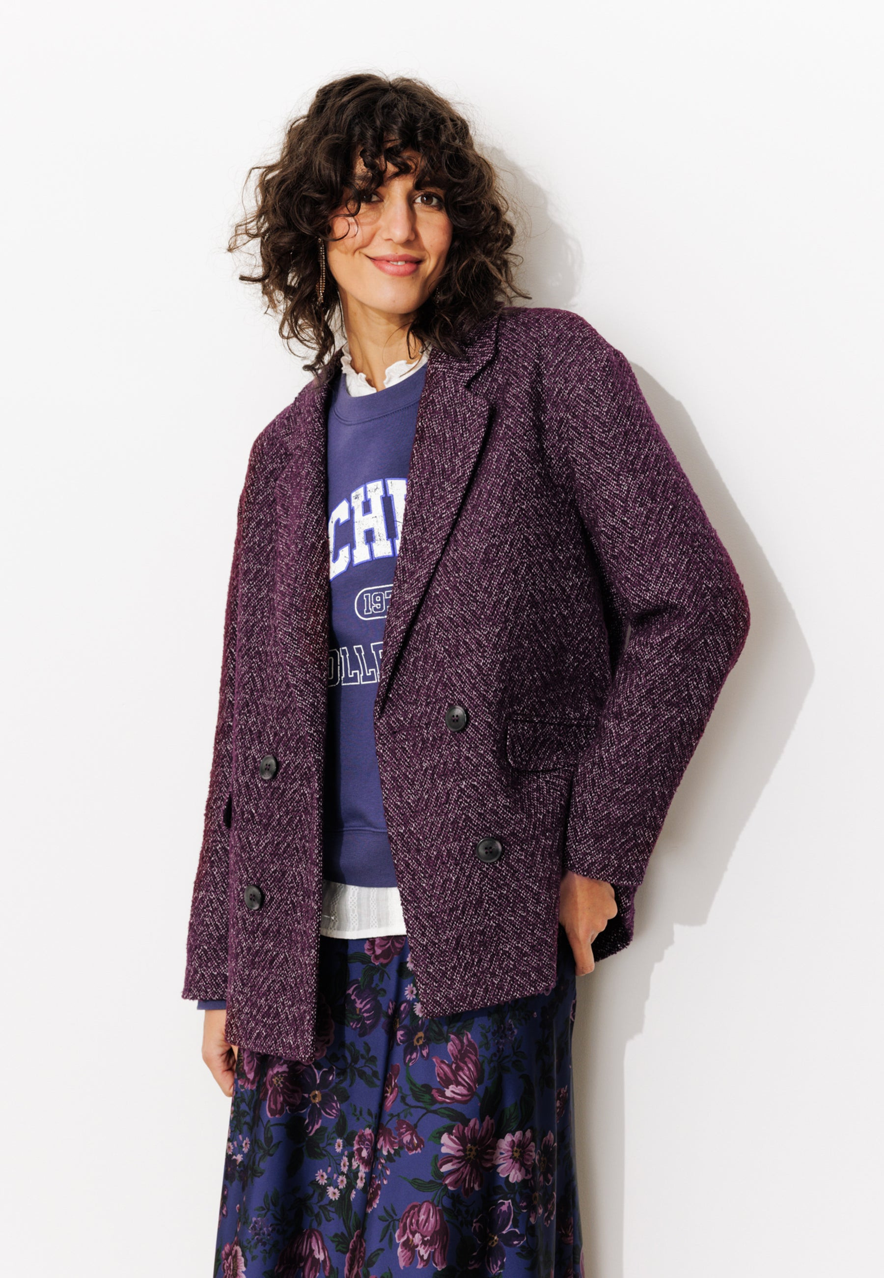 Choisir cette veste automne-hiver, c'est prendre une bonne décision pour avoir toujours le bon style, au bon moment ! Focus sur ton effet tweedé chiné bicolore, enrichi en laine. Col à revers crantés. Fermeture croisée. Double boutonnage. 2 poches à rabat. Emmanchures légèrement descendues. Manches longues. Base droite. Doublure. Cette veste femme contient des fibres recyclées.