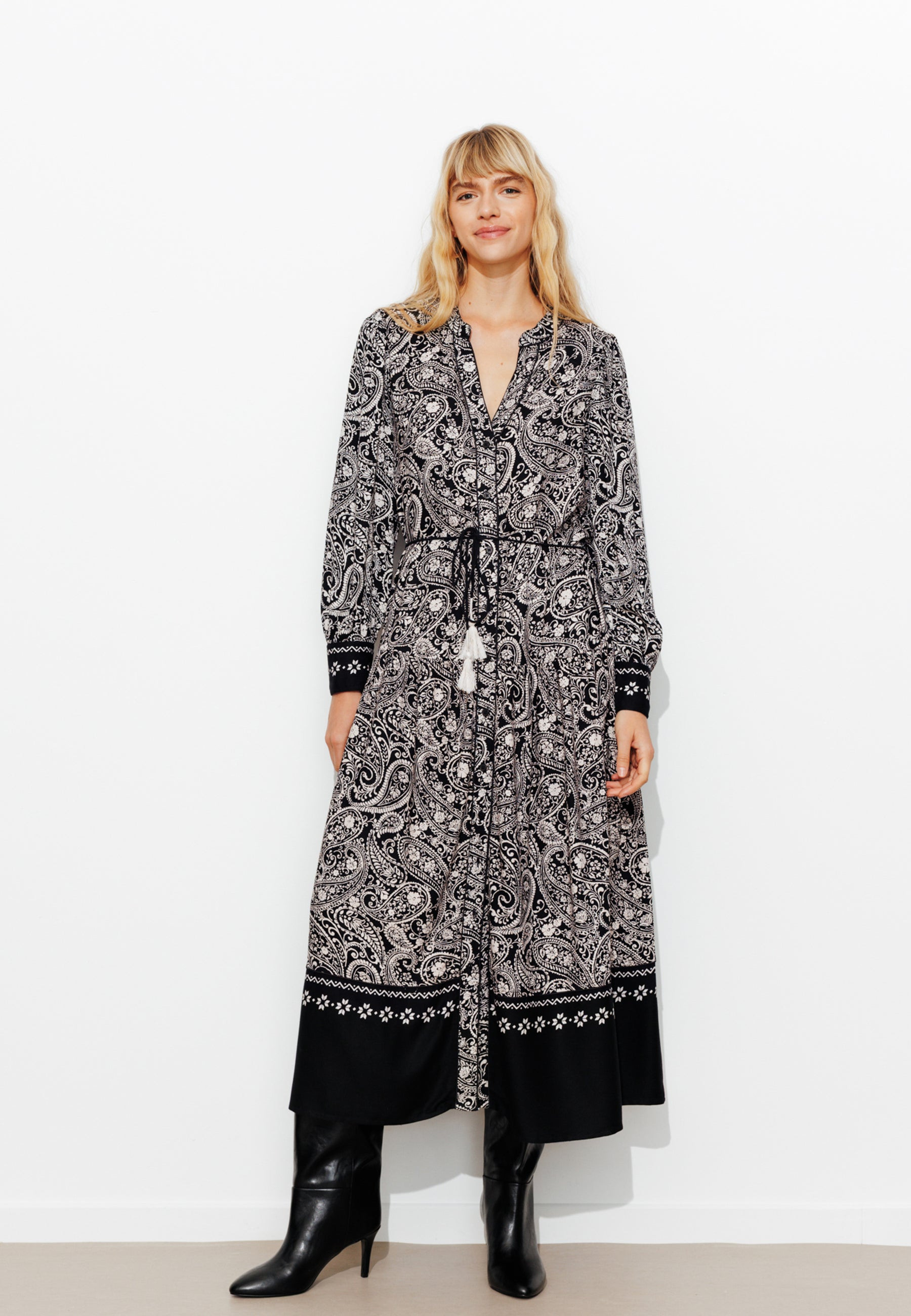 Vibration bohème : on aime ! Cette longue robe imprimée collectionne les bons détails : longues manches bouffantes, cordon à pompons à nouer à la taille, liseré en finition. A porter avec des bottes pour accentuer l'esprit folk. Tissu doux. Coupe évasée. Col tunisien. Ouverture boutonnée. Poignets boutonnés. 100% viscose issue de pulpe de bois provenant de forêts gérées