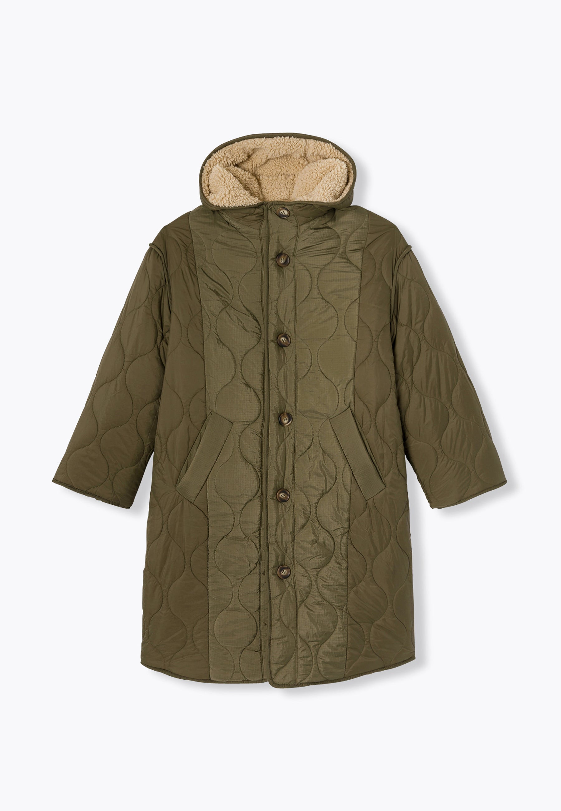 Bulletin météo-mode automne-hiver. La version longue d'ADELE est encore plus cocoon avec sa grande capuche. Comme sa petite sœur courte, elle est réversible : un côté en moumoute sherpa super doux et un côté matelassé uni classy. Coupe droite. Col rond. Ouverture boutonnée. Manches longues. 2 poches. Base droite. Coutures ton sur ton. Cette veste femme contient des fibres recyclées.