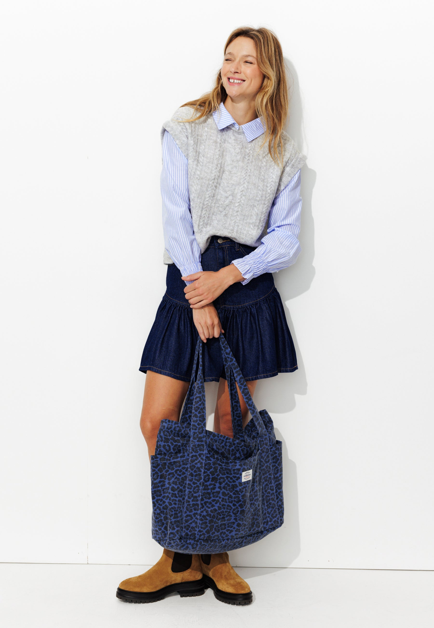 La petite nouveauté à noter : le col chemise rayé est amovible (boutonné à l'intérieur) : avec ou sans, c'est parfait ! Super trendy, l'effet superposé est très bien réalisé, impossible à deviner... Pull en maille moelleuse torsadée devant et point de riz dans le dos. Coupe droite et courte. Manches et col en coton mélangé rayé. Poignets volantés élastiqués. Base droite. Bords-côtes.